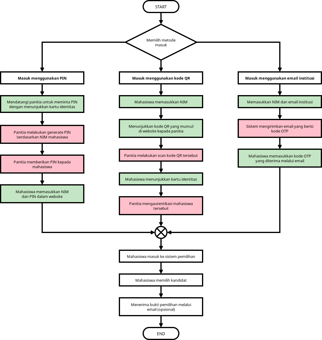 Apabila menggunakan PIN dan kode QR, mahasiswa diperlukan untuk datang ke lokasi pemilihan (dilakukan secara offline) untuk menunjukkan kartu identitas dan berinteraksi dengan panitia